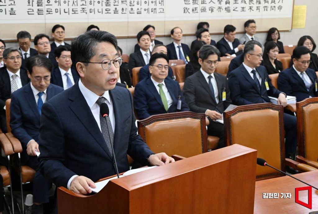 노만석 검찰총장 직무대행이 27일 서울 여의도 국회 법제사법위원회에서 열린 2025년 국정감사에서 기관 보고하고 있다. 김현민 기자