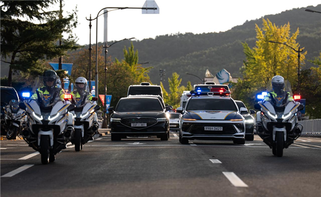 경호안전통제단이 지난 25일과 27일 경주와 부산 일대에서 '2025년 APEC정상회의' 경호안전 대비를 위한 FTX(종합상황훈련)을 실시했다. 사진은 참가국 국빈들의 안전한 이동을 위해 기동훈련을 하는 모습. 사진=대통령경호처 제공