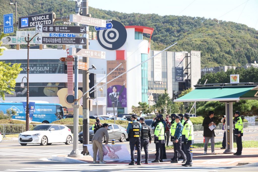 정상회의장인 경주 화백 컨벤션센터(HICO) 입구에는 보안 검문대가 설치됐다. 행사장 진입 차량은 다중 검문 절차를 거쳐야 한다. 도보 이동로에도 탐지견과 경계 인력이 투입돼 외부인 출입을 통제하고 있다. 경찰 기동대와 특공대, 헬기, 육군 장갑차도 정상 숙소와 회의장 주변에 배치됐다. 행사장 반경 수㎞는 사실상 외부인의 무단 접근이 금지된 상황이다.