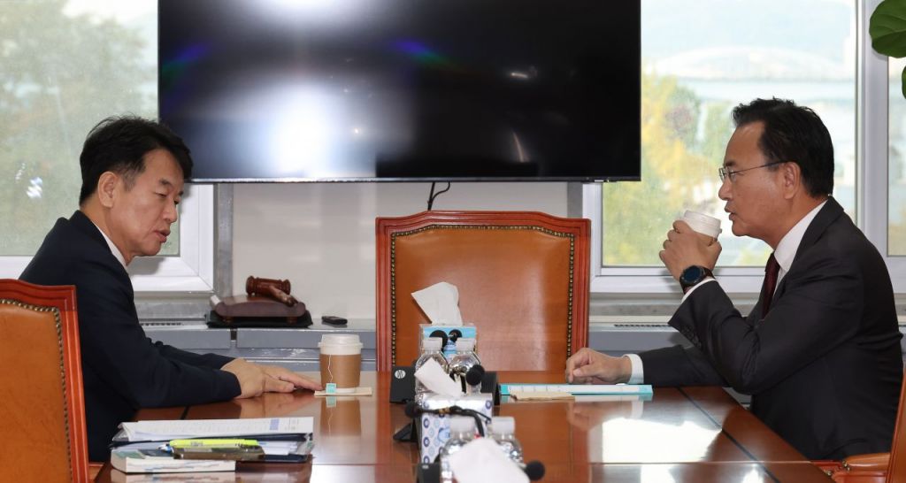 28일 서울 여의도 국회에서 문진석 더불어민주당 원내수석부대표와 유상범 국민의힘 원내수석부대표가 만나 이야기를 하고 있다. 연합뉴스