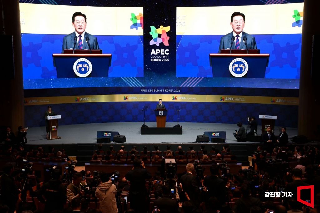 이재명 대통령이 29일 오전 경북 경주 예술의전당 화랑홀에서 열린 2025 아시아태평양경제협력체 최고경영자 서밋(APEC CEO SUMMIT)에서 기조연설을 하고 있다.
