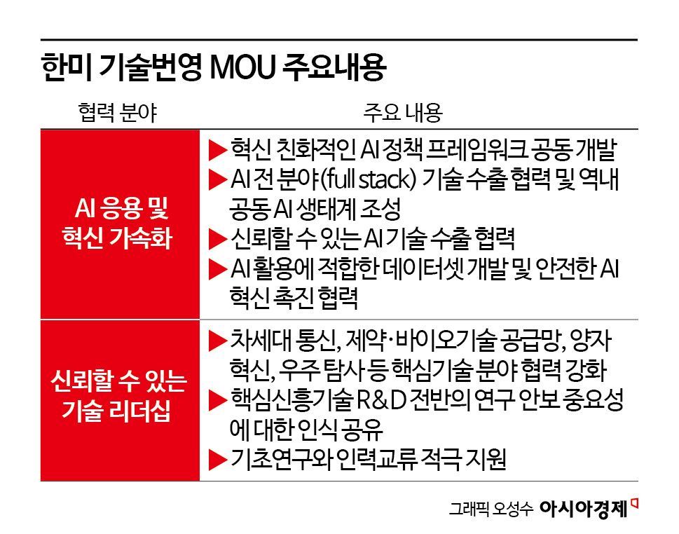 이날 경주 APEC 현장에서 열리는 체결식에는 하정우 대통령실 AI미래기획수석과 마이클 크라치오스 미국 백악관 과학기술정책실장이 참여한다. 이어 양자 면담을 통해 이번 MOU의 이행 방안을 논의하기로 했다. 양국은 내년 워싱턴DC에서 한미 과학기술공동위원회를 열고 구체적이고 발전된 협력 방안을 마련하기로 했다.