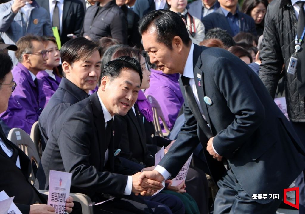 정청래 더불어민주당 대표와 장동혁 국민의힘 대표가 29일 서울 광화문광장에서 열린 '10.29 이태원 참사 3주기 기억식'에 참석, 인사를 나누고 있다.