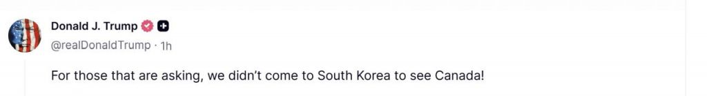 트럼프 대통령은 이날 자신이 만든 사회관계망서비스(SNS)인 트루스소셜에 "물어보는 사람들이 많은데, 우리는 캐나다를 보러 한국에 온 것이 아니다"고 적었다.