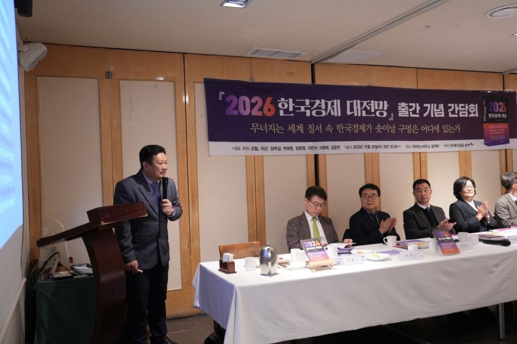 신간 '2026 한국경제 대전망' 저자 이근 서울대학교 명예교수가 29일 서울 중구의 한 음식점에서 출간 기념 간담회 중 발표하고 있다. 서믿음 기자