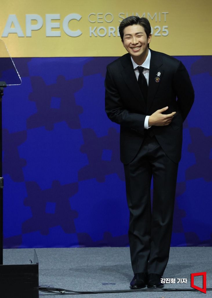 그룹 BTS의 RM이 29일 경북 경주예술의전당에서 열린 아시아태평양경제협력체(APEC) 정상회의 최고경영자(CEO) 서밋(Summit)에 참석해 'APEC 지역 내 문화산업과 K-컬쳐 소프트파워'를 주제로 연설 후 인사하고 있다.