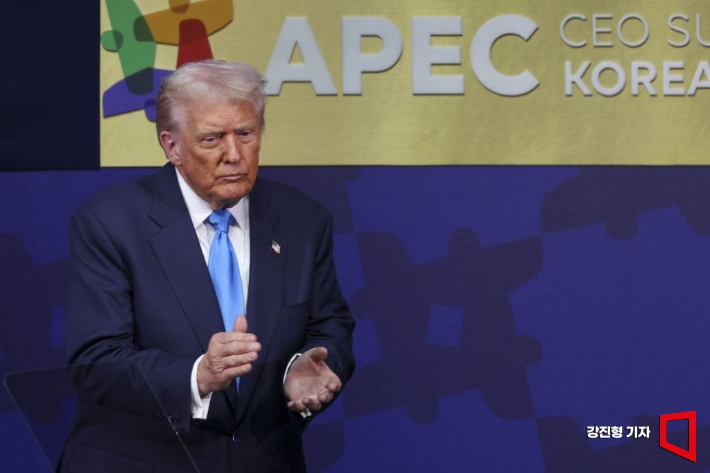 도널드 트럼프 미국 대통령이 29일 경북 경주 예술의전당에서 열린 '2025 아시아태평양경제협력체 최고경영자 서밋(APEC CEO SUMMIT)'에 참석해 정상 특별연설을 마친 뒤 박수치고 있다. 강진형 기자