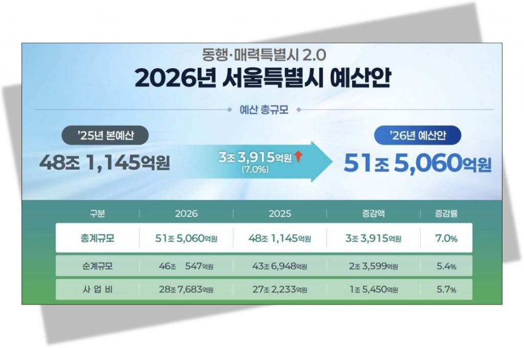 서울시가 2026년도 예산안으로 총 51조5060억원을 편성했다. 서울시 핵심 정책 기조인 '약자와의 동행'에 더 집중하겠다는 의지로, 연계 사업에만 15조원을 넘게 투입한다. 정부의 민생회복 소비쿠폰 발행으로 채무가 늘었지만 재원을 효율적으로 배분해 건전재정을 지켜내겠다는 게 서울시 방침이다.