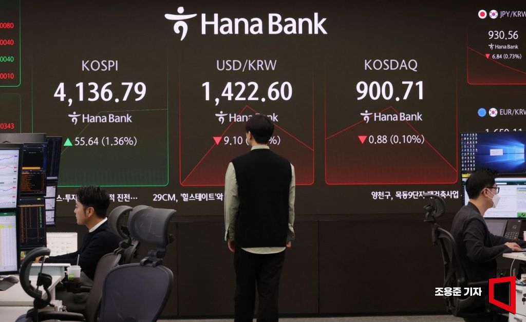 30일 서울 중구 하나은행 딜링룸 현황판에 코스피, 원·달러 환율 등이 표시돼 있는 모습.