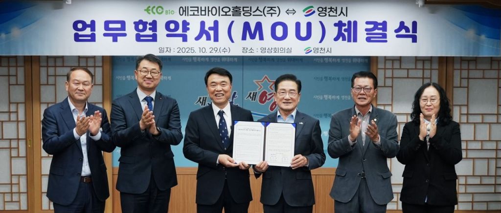 영천시는 29일 시청 영상회의실에서 최기문 시장, 송효순 에코바이오홀딩스㈜ 대표 등 관계자들이 참석한 가운데 '바이오가스 기반 청정수소 생산 통합사업'에 관한 업무협약(MOU)을 체결했다.