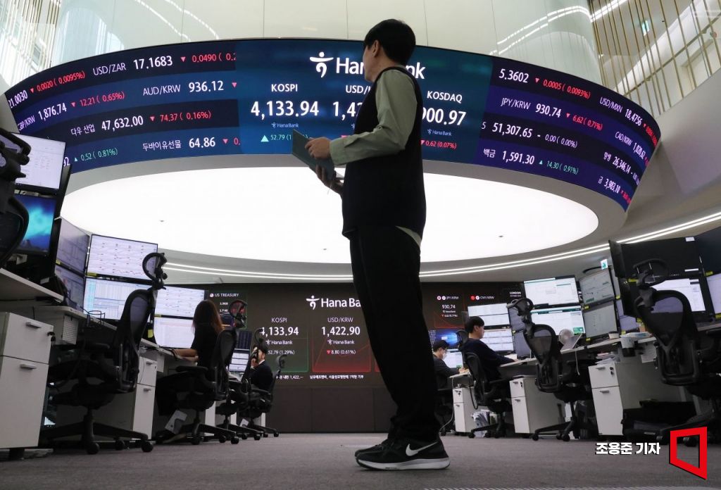 코스피 지수가 연일 사상 최고치를 경신하고 있는 가운데 30일 서울 중구 하나은행 딜링룸 현황판에 코스피, 원/달러 환율 등이 표시돼 있다. 이날 코스피는 전장보다 24.80포인트(0.61%) 오른 4,105.95으로 시작해, 한때 4,146.72로 장중 역대 최고치를 경신했다. 2025.10.30 조용준 기자