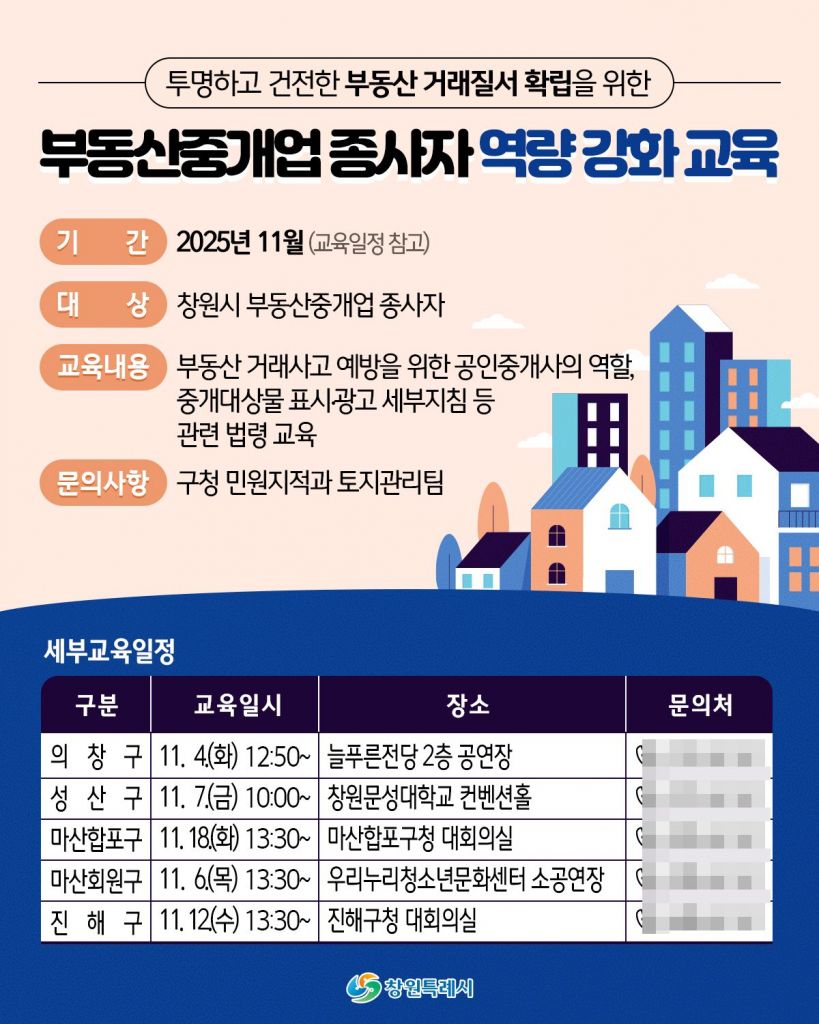경남 창원특례시는 건전하고 안전한 부동산 거래 환경 조성을 위해 부동산중개업 종사자를 대상으로 '부동산 거래사고 예방 및 역량 강화 교육'을 실시한다.