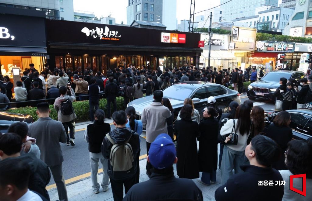 이재용 삼성전자 회장, 정의선 현대차그룹 회장, 젠슨 황 엔비디아 최고경영자(CEO)가 30일 오후 만날 것으로 알려진 서울 삼성동 치킨집 주변이 취재진과 구경나온 사람들로 북적이고 있다.