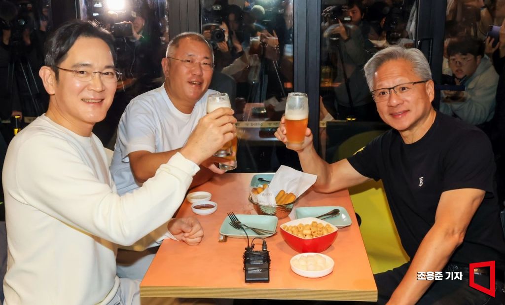 이재용 삼성전자 회장(왼쪽부터)과 정의선 현대차그룹 회장, 젠슨 황 엔비디아 최고경영자(CEO)가 30일 저녁 서울 삼성동의 한 치킨집에서 '치맥' 회동을 하고 있다. 2025.10.30 조용준 기자
