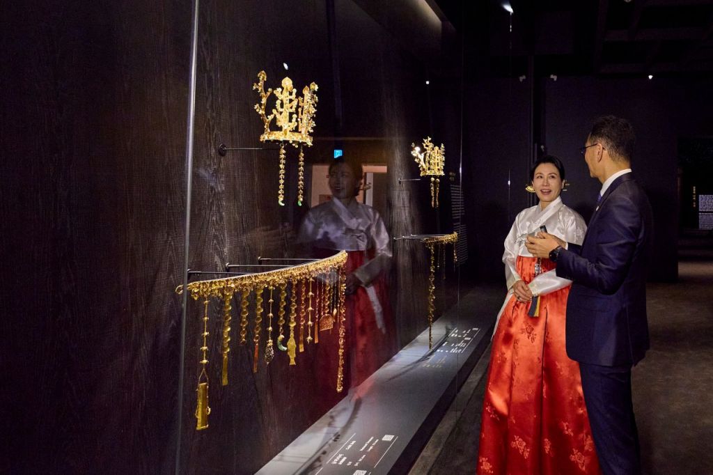 김혜경 여사는 2025 아시아태평양경제협력체(APEC) 정상회의가 열리는 경북 경주의 국립경주박물관을 찾아 신라 금관과 금허리띠를 관람했다.