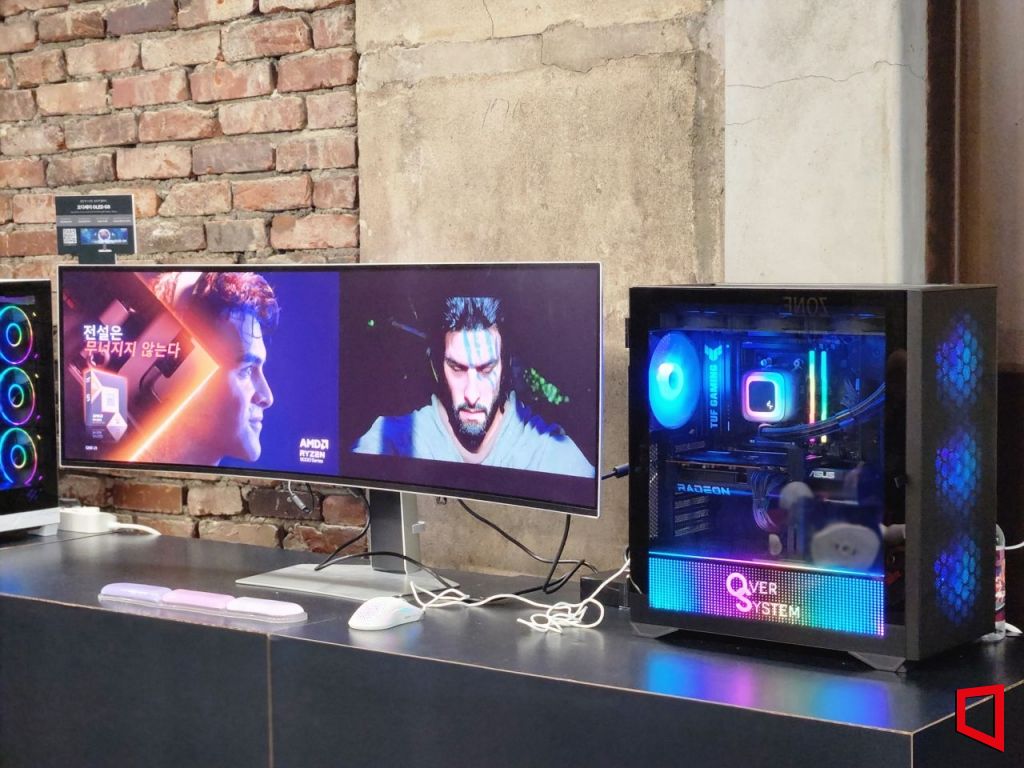 DRC 홍대에서 열린 ‘붉은사막 X AMD 팝업스토어 2025’ 1층에 마련된 모니터. AMD 라이젠(Ryzen) 프로세서 시리즈 홍보용 마케팅 슬로건 "전설은 무너지지 않는다"가 적혀있다. 사진=박유진 기자