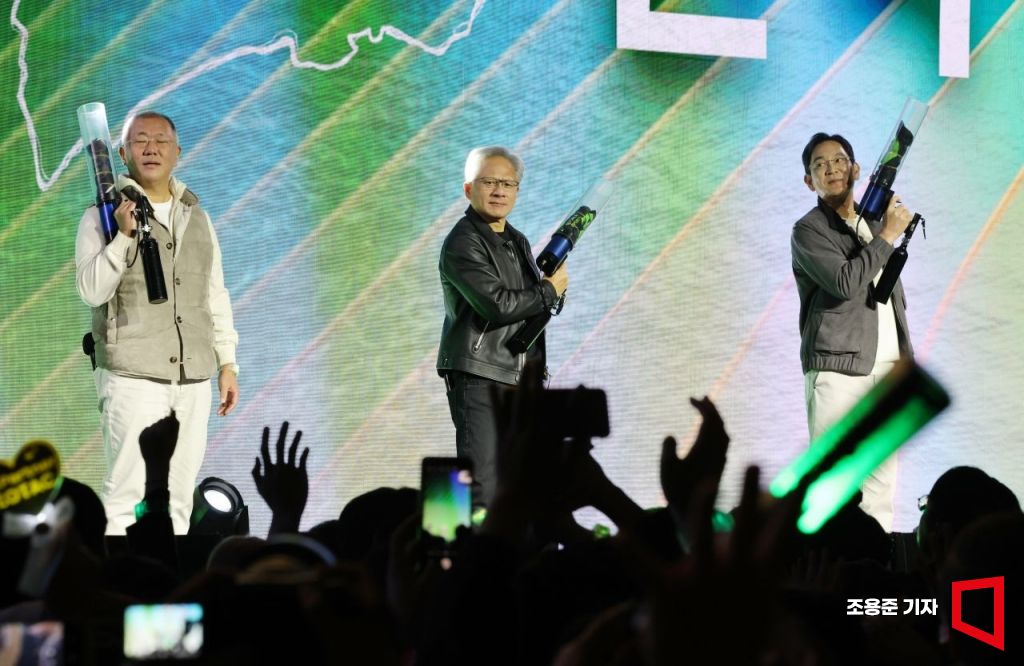 젠슨 황 엔비디아 최고경영자(CEO)와 이재용 삼성전자 회장, 정의선 현대차그룹 회장이 30일 서울 코엑스에서 열린 엔비디아의 그래픽카드(GPU) '지포스' 출시 25주년 행사 단상에 올라 퍼포먼스를 하고 있다. 조용준 기자