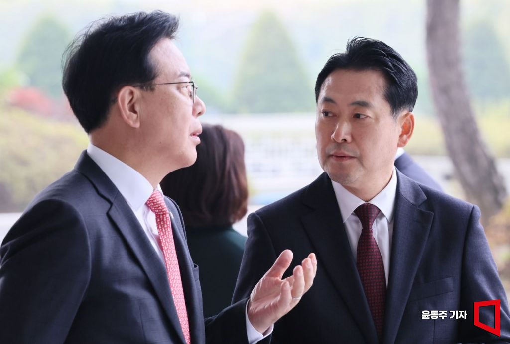 장동혁 국민의힘 대표와 송언석 원내대표가 31일 서울 서초구 내란특검 앞에서 특검 조사 중인 추경호 전 원내대표를 기다리는 도중 이야기를 나누고 있다. 2025.10.31