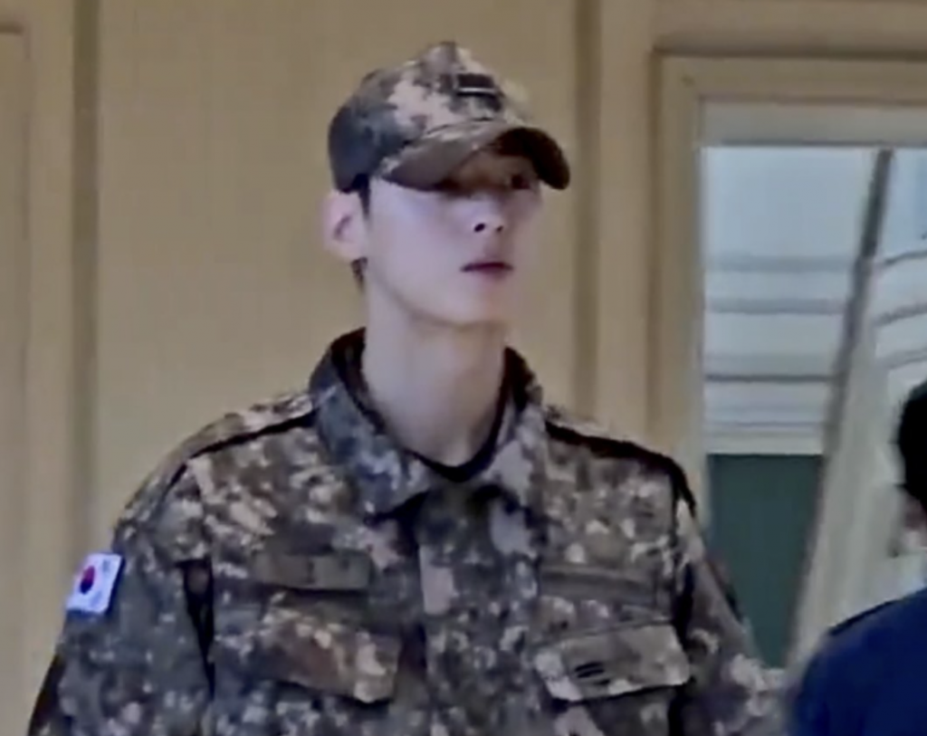 공개된 영상에서 차은우는 군복을 입은 채 경주의 한 호텔 로비를 걷고 있다.