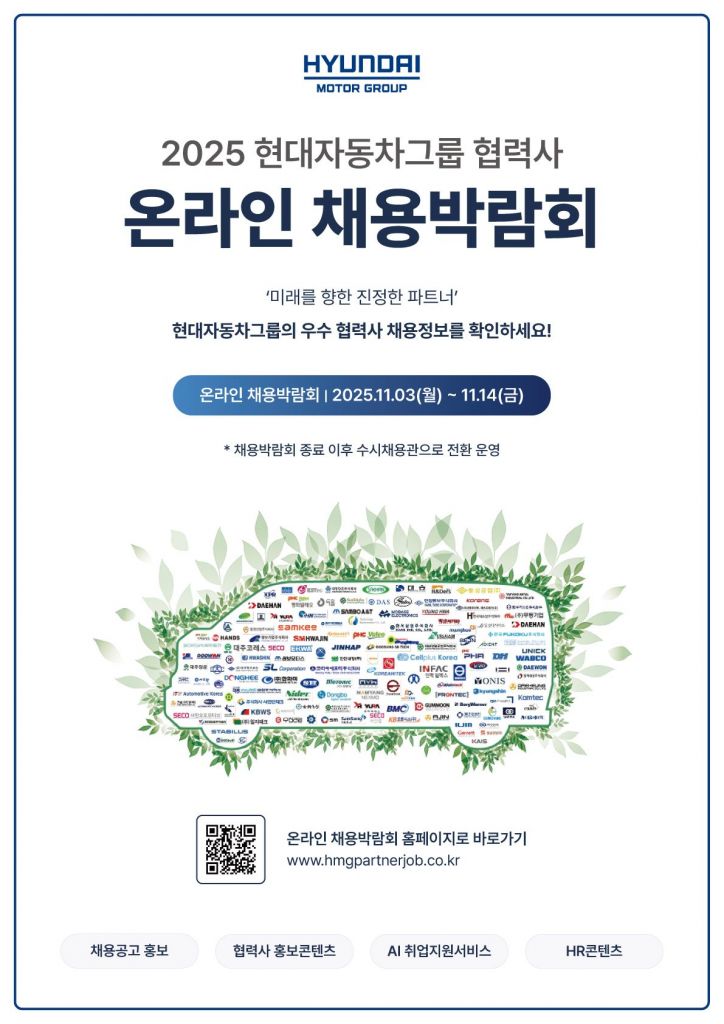 현대자동차그룹이 협력사와 함께 '2025 현대자동차그룹 협력사 온라인 채용박람회'를 개최한다고 2일 밝혔다.