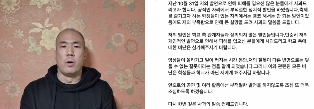 정상수는 1일 자신의 사회관계망서비스(SNS)에 사과 영상을 올리고 "충암고 축제 무대를 진행하는 과정에서 해서는 안 될 정치적 발언을 했다"며 "교직원과 학생들에게 피해를 준 점 대단히 죄송하다"고 밝혔다.