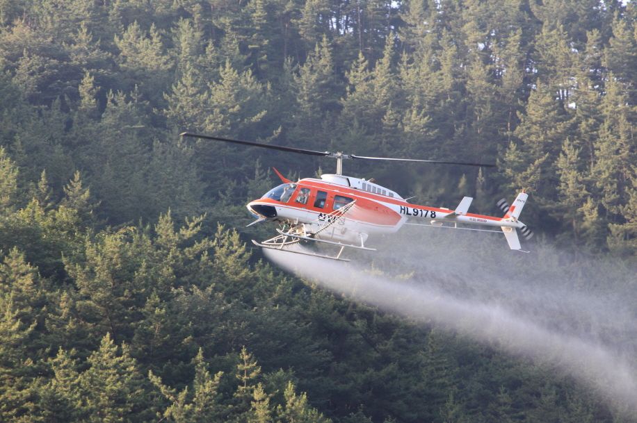 소나무재선충병 항공방제를 하고 있는 산림헬기