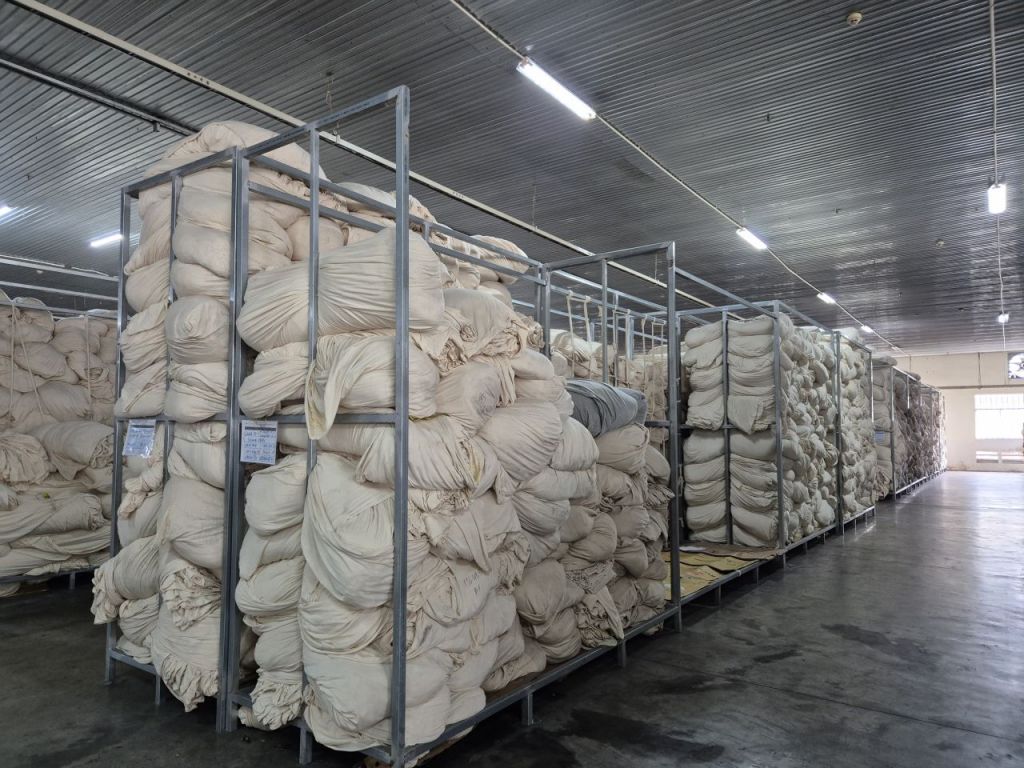지난달 30일 방문한 편직단지 공장은 170여개의 편직기가 각각 반투명한 비닐하우스 안에서 쉴 새 없이 하얀색 천을 뽑아냈다. 편직기를 모두 가동할 경우 하루 기준 생산량은 300㎏이다. 티셔츠 900장(1㎏당 3장)을 만들 수 있는 양이다. 이 공장은 부광섬유가 2015년부터 10년째 운영 중이다.