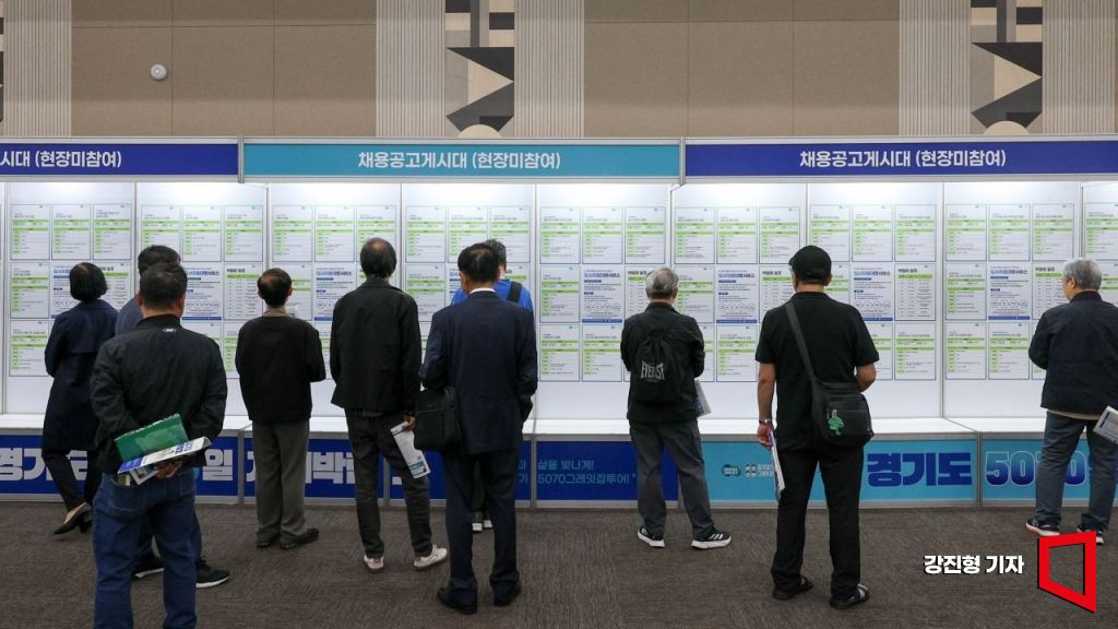 지난달 경기 고양 킨텍스에서 열린 '경기도 5070 일자리 박람회'에 참가한 구직자들이 채용 게시판을 보고 있다.