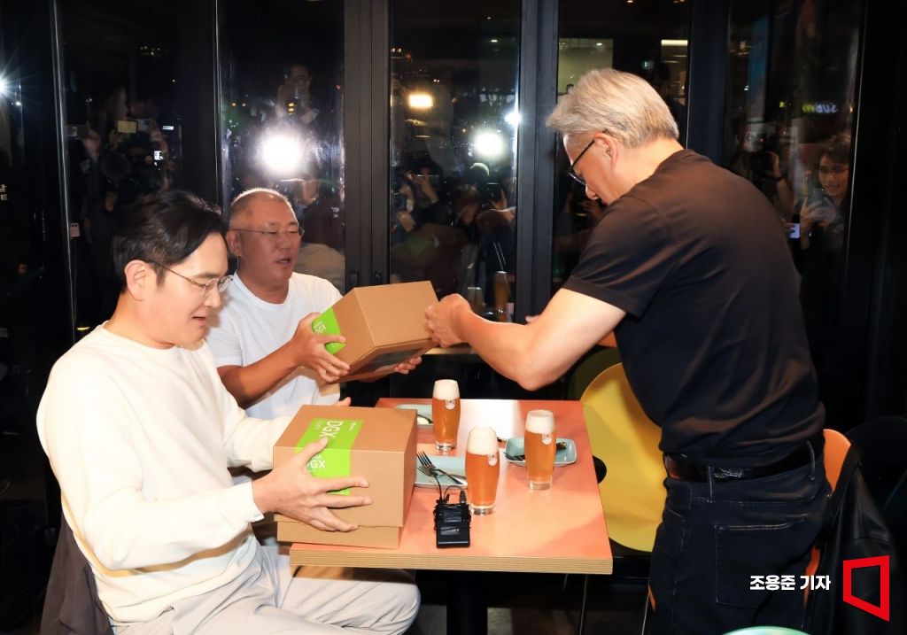 상황은 달라졌다. 황 CEO가 이재용 삼성전자 회장, 정의선 현대차 회장과 치맥(치킨+맥주)을 하고 연단에 올라 한국 국민을 향해 메시지를 보낸 것은 이런 이유다. 황 CEO는 방한 기간 이 회장, 정 회장, 최 회장에게 'DGX스파크' 초미니 슈퍼컴퓨터를 전달했다. 황 CEO에게 직접 이 선물을 받은 이는 일론 머스크 테슬라 CEO와 샘 올트먼 오픈AI CEO 정도다. 황 CEO에게서 직접 DGX스파크를 전달받은 기업은 로켓, AI, 반도체, 자동차기업이다. 미국 기업을 제외하면 한국 기업이 주류다. 향후 GPU를 중심으로 형성될 제조 혁신 연구의 중심축이 한국임을 보증한 셈이다.