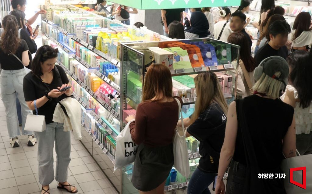 13일 올리브영 명동점에서 외국인이 대부분인 고객들이 화장품을 고르고 있다. 사진=허영한 기자 younghan@