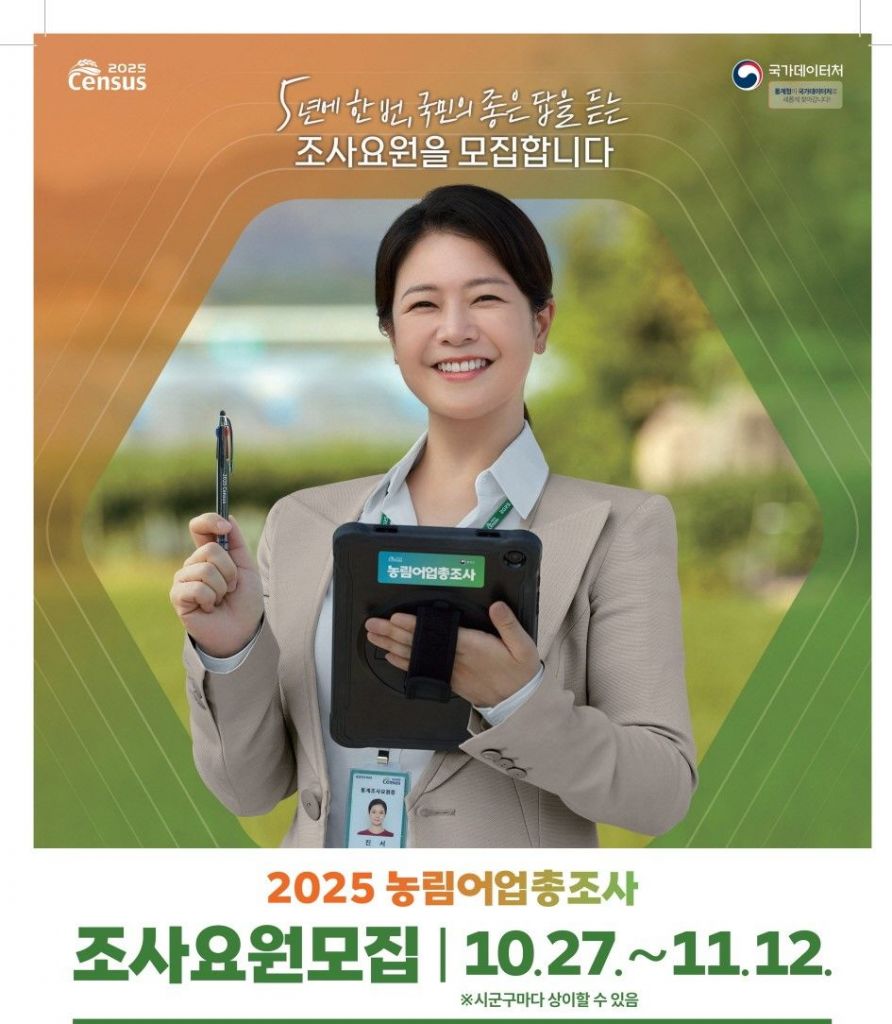 기장군(군수 정종복)은 오는 7일까지 '2025 농림어업총조사' 현장 조사를 담당할 조사요원 45명을 모집한다.
