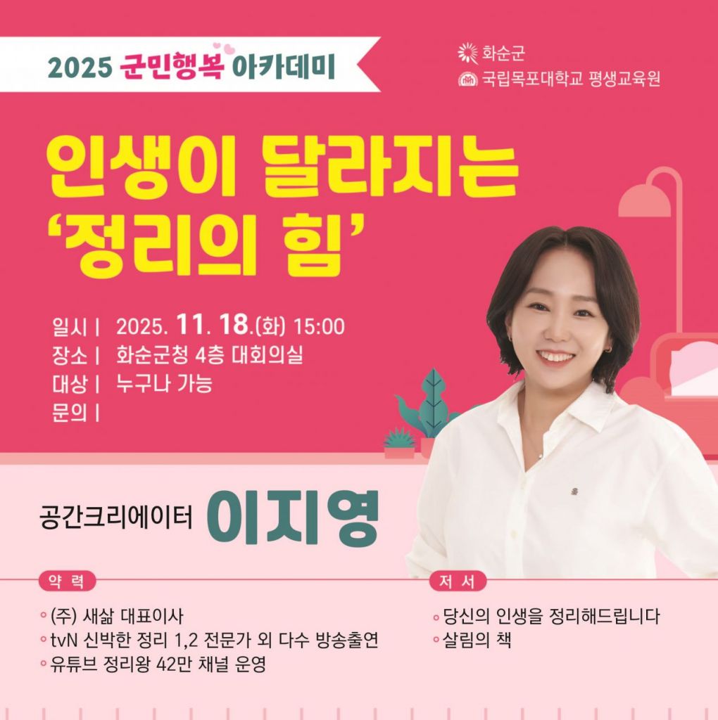 전남 화순군이 오는 18일 오후 3시 화순군청 4층 대회의실에서 이지영 정리 전문가를 초청, '2025 군민행복 아카데미' 9회차 강연을 연다.