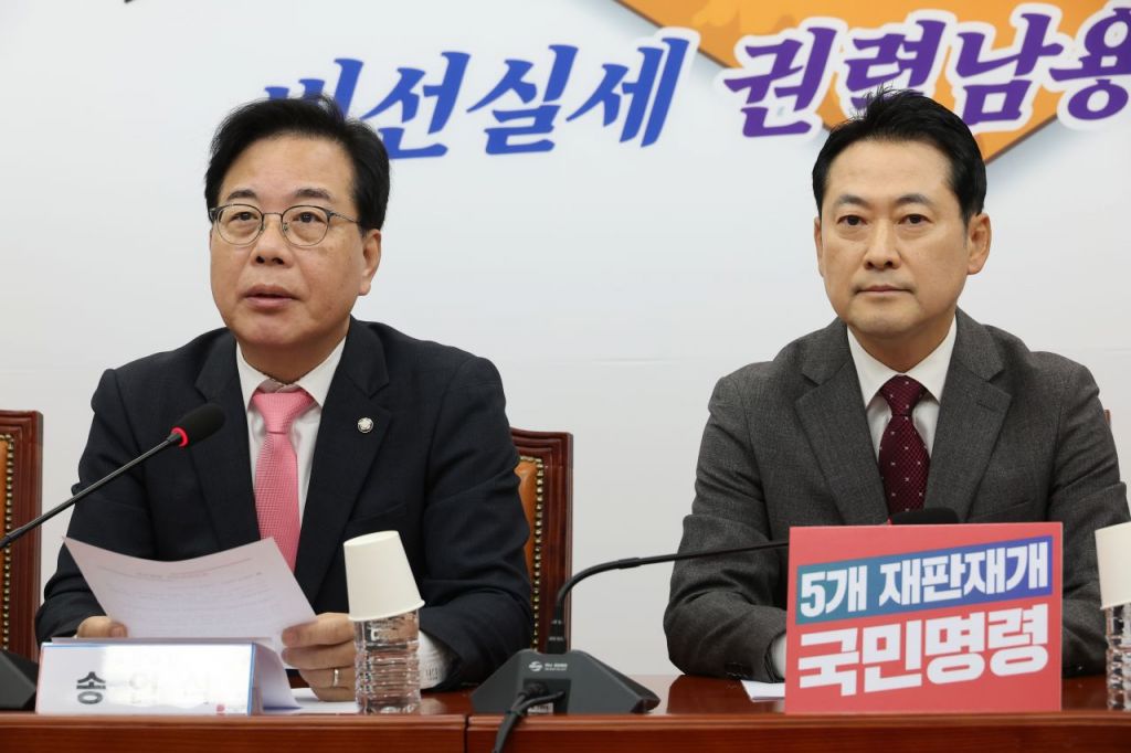 민주당이 대통령 재판을 임기 중 멈추는 형사소송법 개정안을 뜻하는 '재판중지법'을 추진하지 않겠다고 밝힌 데 대해선 "아침에는 '강력 추진하겠다고 하면서 원인이 법원과 국민의힘에 있다'는 식으로 강변하더니 몇 시간 되지 않아 당정이 의견을 조율해 추진하지 않겠다고 했다"고 했다.
