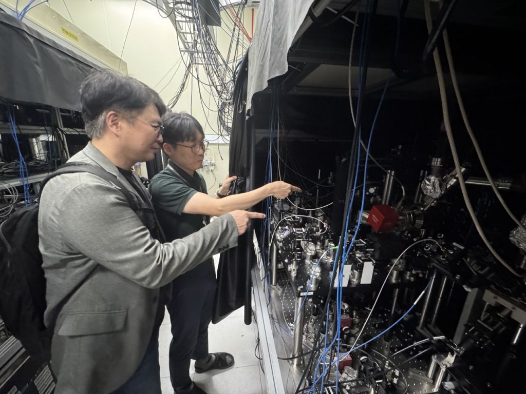 문종철 한국표준과학연구원 박사(오른쪽)가 연구실에서 백종민 아시아경제 테크 스페셜리스트에게 중성원자 양자컴퓨터 연구 장비를 설명하고 있다. 사진=한국표준과학연구원