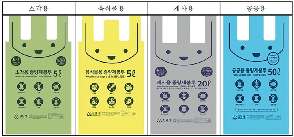 성남시 종량제봉투 종류(소각용, 음식물용, 재사용, 공공용). 성남시 제공