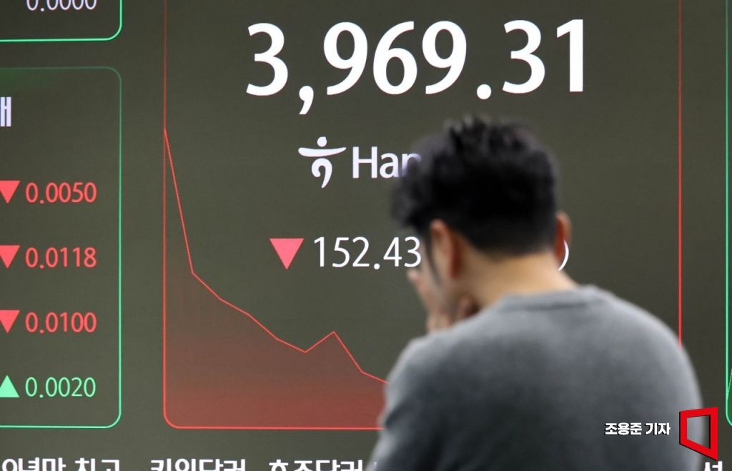 코스피가 미국 기술주 급락에 덩달아 휘청이며 장중 4% 이상 급락한 5일 서울 중구 하나은행 딜링룸 현황판에 코스피, 코스닥 등이 표시돼 있다. 이날 9시 9분 기준 코스피는 전장보다 123.87포인트(3.01%) 하락한 3,997.87시작하며 4,000선을 돌파한지 7거래일 만에 3,900선도 내줬다.