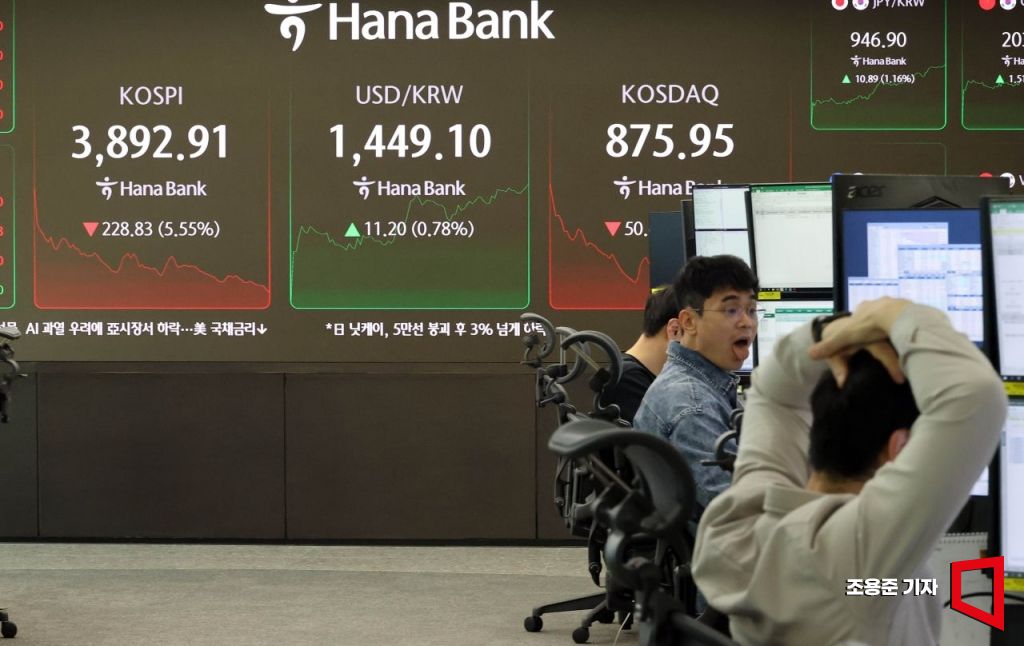 코스피가 미국 기술주 급락에 덩달아 휘청이며 장중 5% 이상 급락하며 3,900선이 무너진 5일 서울 중구 하나은행 딜링룸 현황판에 코스피, 코스닥 등이 표시돼 있다. 이날 9시 9분 기준 코스피는 전장보다 123.87포인트(3.01%) 하락한 3,997.87시작하며 4,000선을 돌파한지 7거래일 만에 3,900선도 내줬다. 2025.11.5 조용준 기자