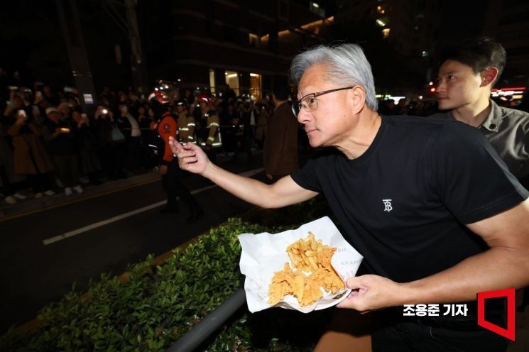 젠슨황 엔비디아 최고경영자가 지난달 30일 이재용 삼성전자 회장, 정의선 현대자동차그룹 회장과 서울 강남구 깐부치킨에서 회동 중 시민들에게 치킨을 내밀고 있다. 조용준 기자