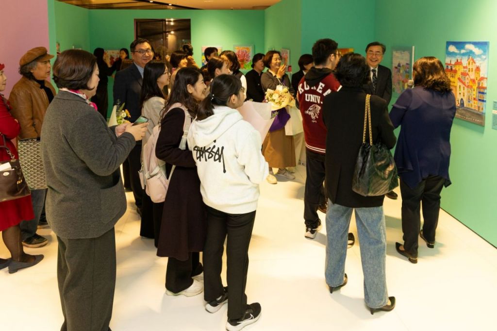 삼성아동교육문화센터에서 열린 서울시 어린이병원 발달장애 아동·청소년 미술치료교육 작품 전시회에서 설명을 듣고 있는 참여작가, 가족들. 삼성복지재단