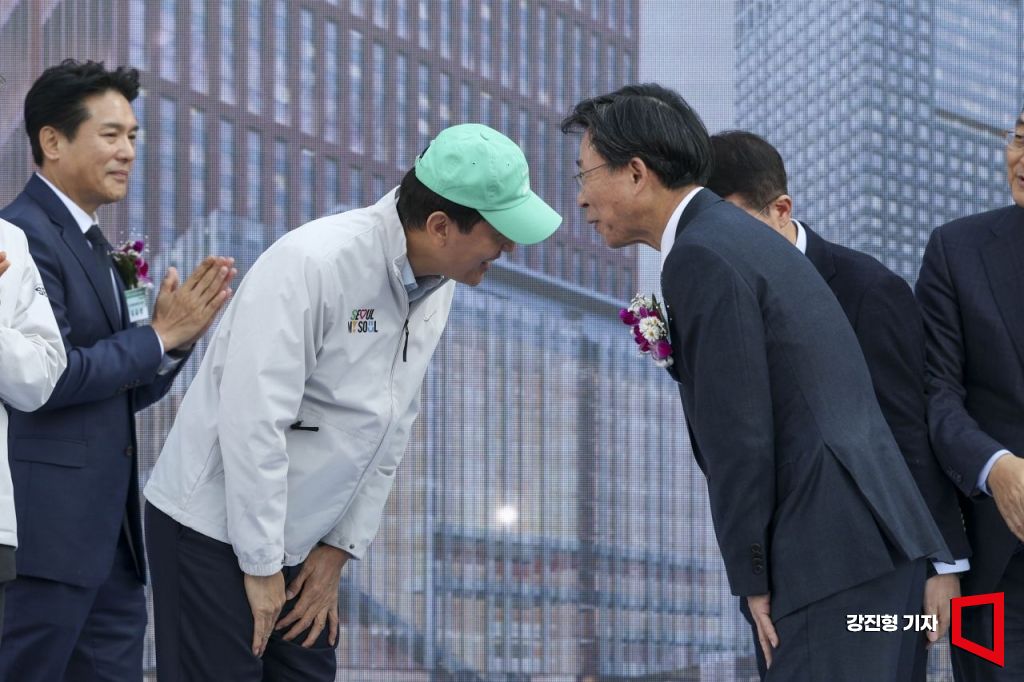 오세훈 서울시장이 5일 서울 중구 순화동 재개발사업 공사현장에서 열린 '녹지생태도심 선도사업 서소문빌딩 재개발 착공식'에서 주요내빈들과 인사하고 있다.