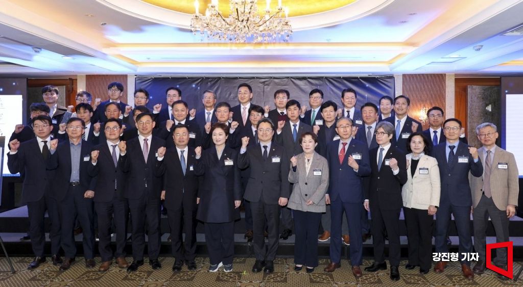 문신학 산업통상부 1차관을 비롯한 양자산업 기업인 및 연구자들이 5일 서울 중구 롯데호텔에서 열린 'K-양자산업연합 출범식'에 참석해 업무협약 체결을 마친 뒤 기념촬영 하고 있다.