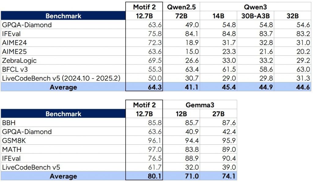 벤치마크 결과 Motif 12.7B 추론 능력을 평가하는 수학, 과학, 논리 과제에서 720억 매개변수를 가진 알리바바 큐원 2.5(72B)을 능가했다. 구글 젬마3 동급 모델과의 비교에서도 주요 추론 능력 관련 평가 지표에서 더 나은 점수를 얻었다.