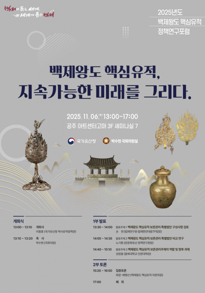 국가유산청과 박수현 의원은 6일 오후 1시 공주 고마센터에서 '백제왕도 핵심유적 정책연구포럼'을 연다.