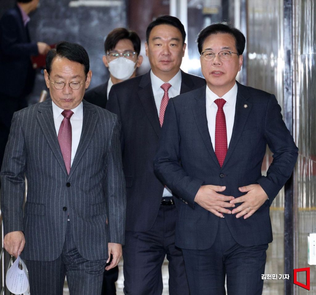 송언석 국민의힘 원내대표가 7일 국회에서 열린 원내대책회의에 참석하고 있다.