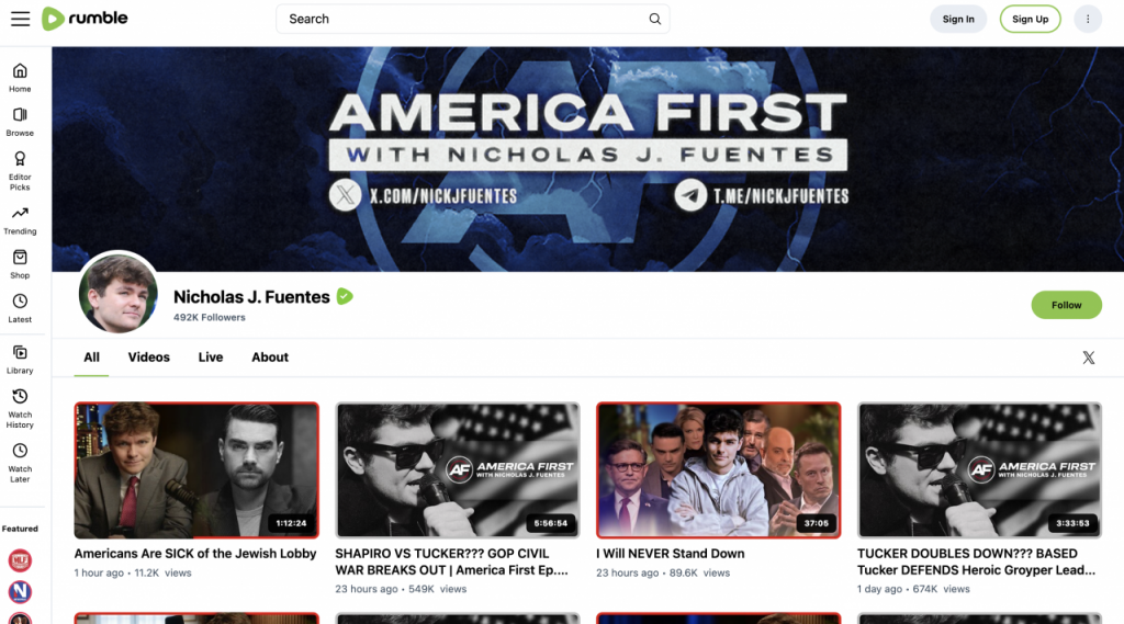 미국의 동영상 플랫폼 럼블(Rumble)의 닉 푸엔테스 계정. 럼블 캡처