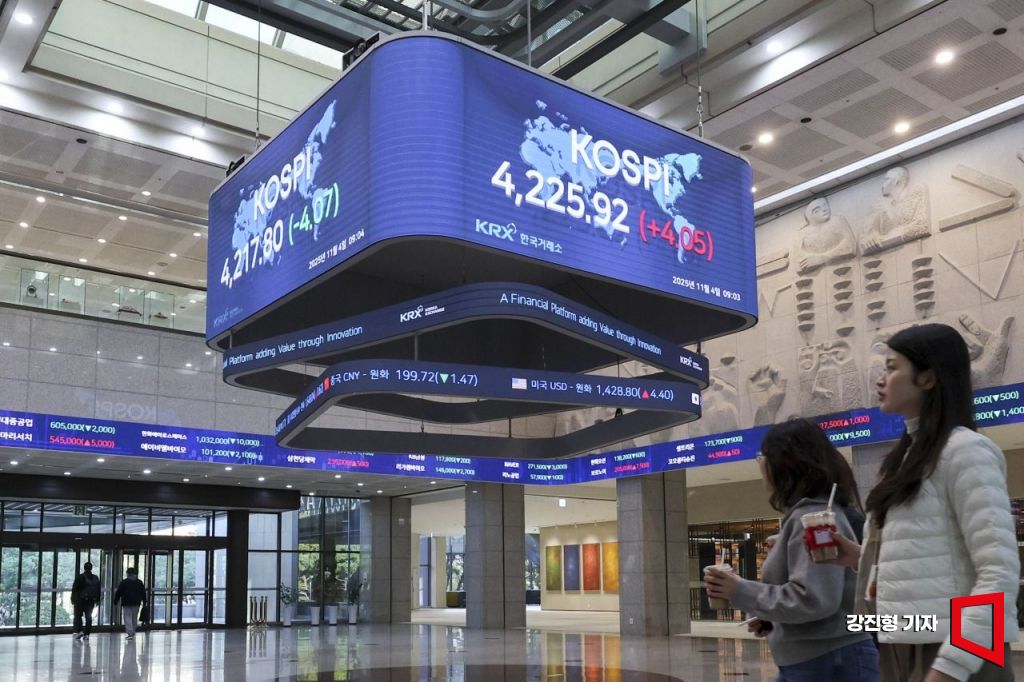 코스피 지수가 전 거래일 대비 2.63포인트 내린 4219.24로 장을 시작한 4일 서울 여의도 한국거래소 전광판에 코스피 지수가 표시돼 있다.