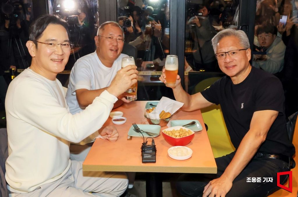 지난달 30일 (사진 왼쪽부터) 이재용 삼성전자 회장과 정의선 현대차그룹 회장, 젠슨 황 엔비디아 최고경영자(CEO)가 서울 삼성동의 한 치킨집에서 '치맥' 회동을 하고 있다. 조용준 기자