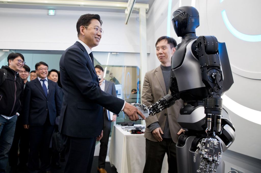 배경훈 부총리 겸 과학기술정보통신부 장관이 13일 오후 서울 성북구 한국과학기술연구원(KIST)을 방문해 AI 휴머노이드 'KAPEX' 시연회 현장에서 휴머노이드의 손을 잡고 있다. 사진=과학기술정보통신부