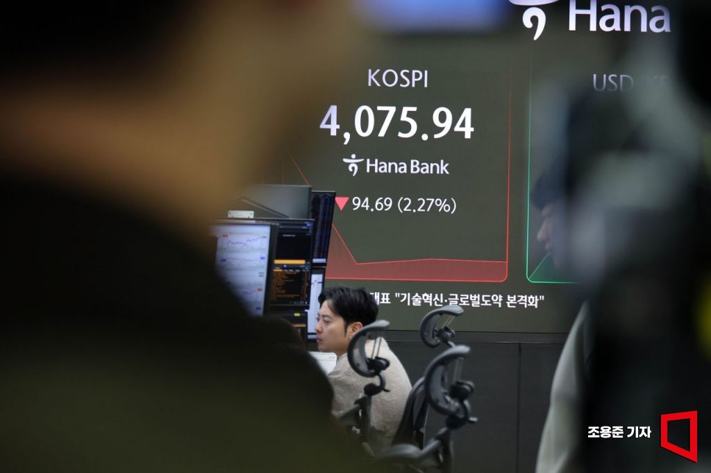 코스피가 장중 2% 넘게 폭락하며 출발한 가운데 14일 서울 중구 하나은행 딜링룸 현황판에 코스피, 원/달러 환율, 코스닥지수 등이 표시돼 있다. 이날 코스피는 전장 보다 2.61% 내린 4061.91에, 원/달러 환율은 4.2원 오른 1471.9원에 코스닥 7.95p(1.95%) 내린 900.422025으로 장을 시작했다. 11.14 조용준 기자