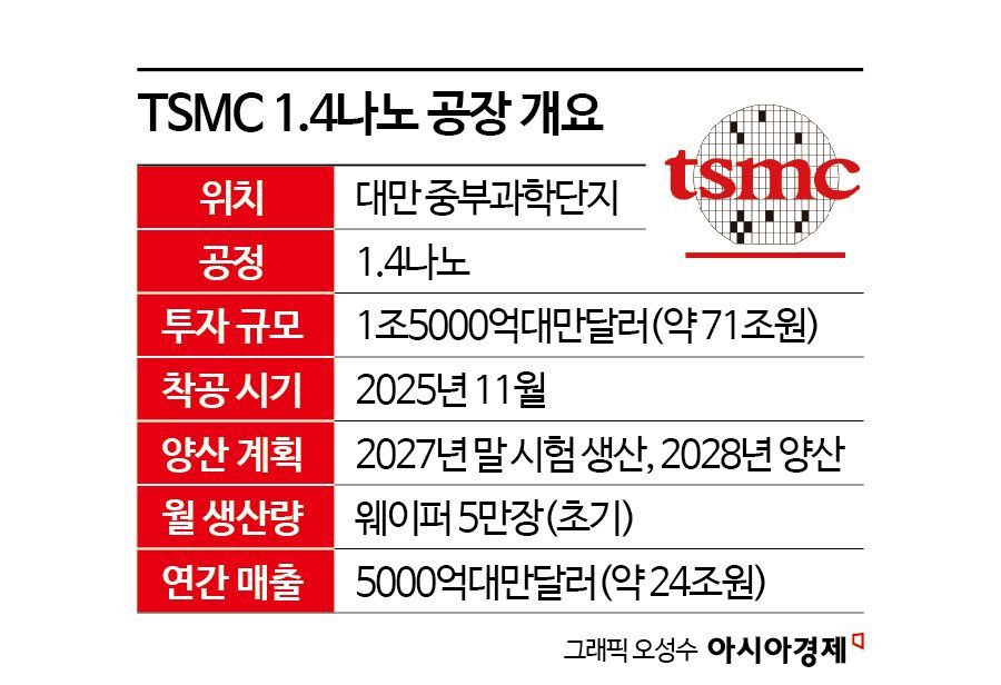 대만 이코노믹데일리뉴스 등 현지 언론에 따르면 TSMC가 대만 중부과학단지에서 추진하는 1.4㎚ 공정의 신규 공장이 지난 5일 기초 공사에 들어갔다. TSMC 측은 "중부과학단지 내 신규 공장이 착공했다"고 확인했다. 전체 프로젝트의 투자 규모는 1조5000억대만달러(약 70조7250억원)에 달할 것으로 예상되며 2027년 말 시험 생산에 들어가 2028년 양산을 목표로 한다. 공장이 예정대로 가동되면 연간 매출은 5000억대만달러(약 23조5700억원)를 상회할 것으로 평가되고 있다.